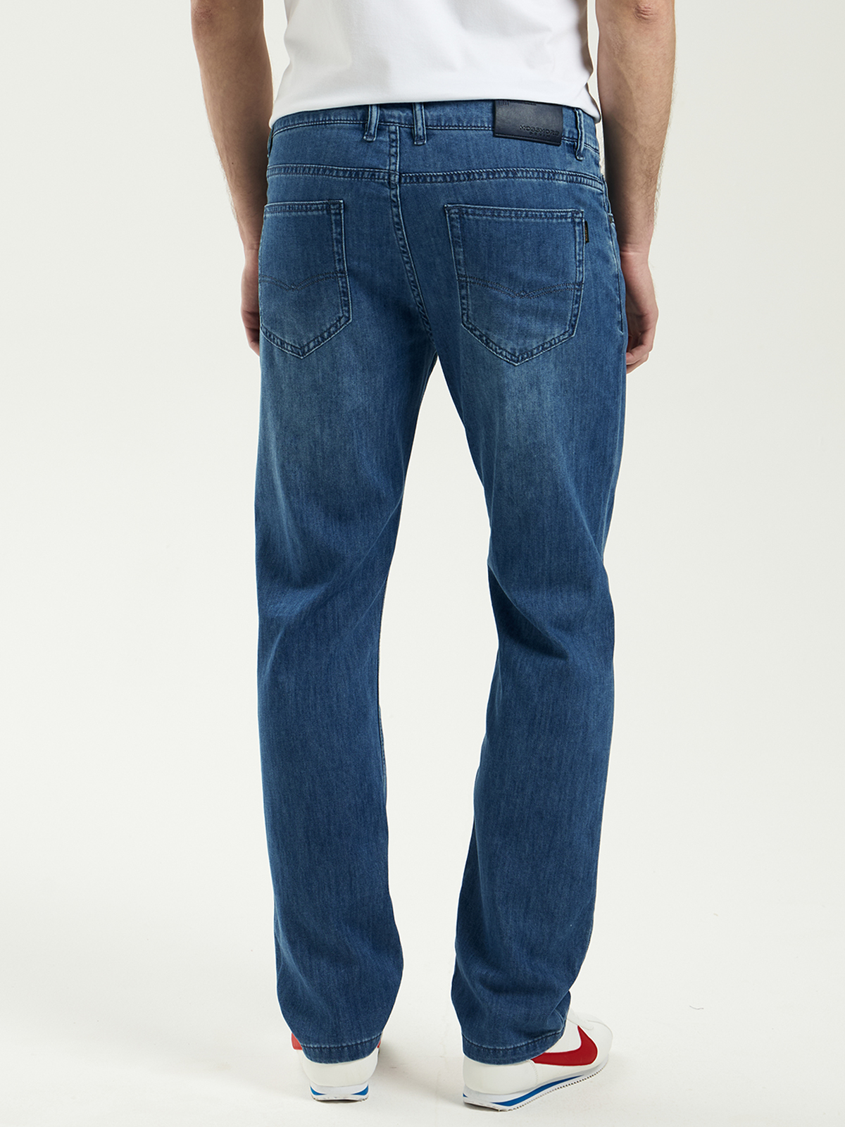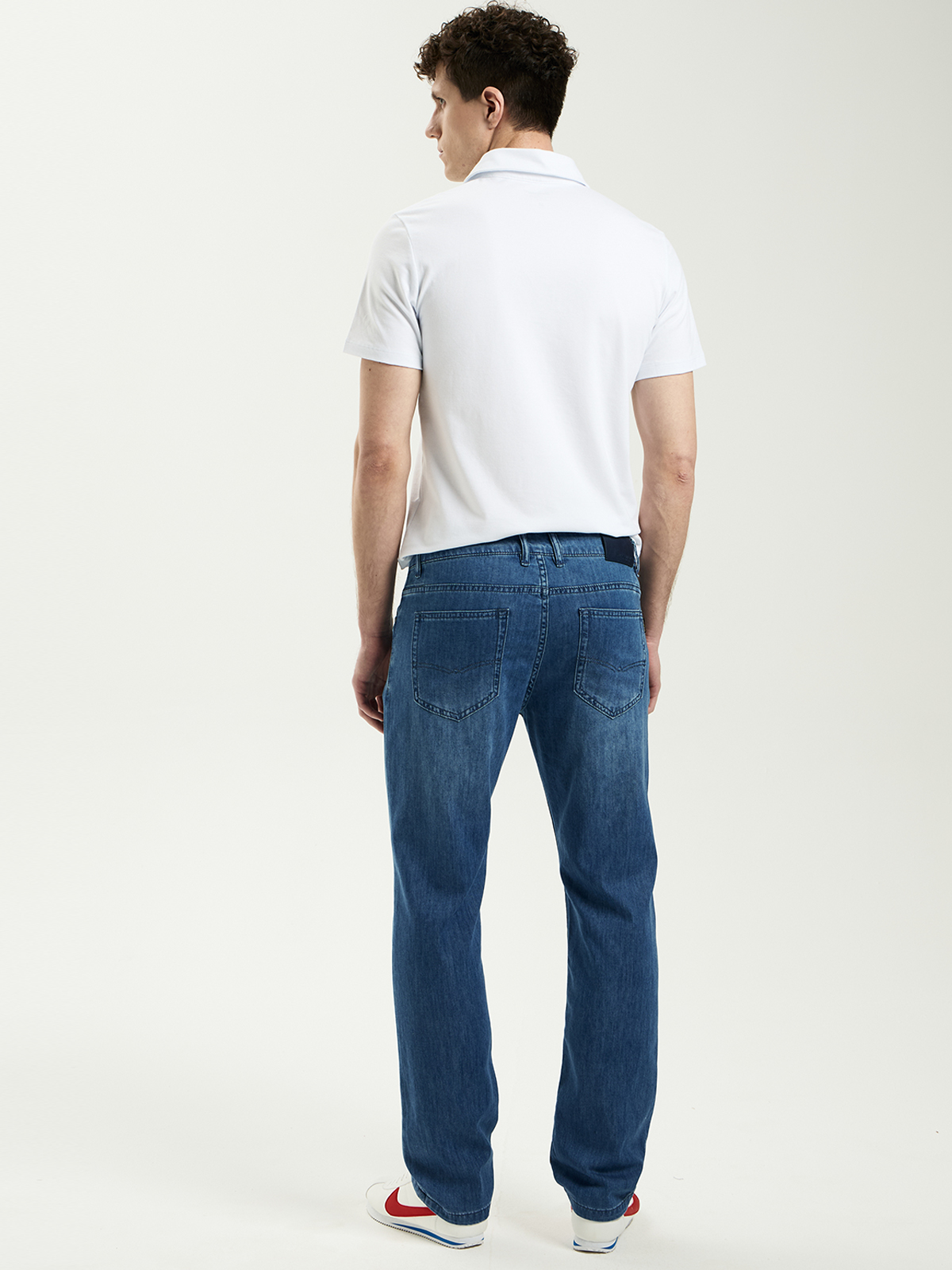 Модель выполнена из облегчённого денима — ткань дарит комфорт и ощущение лёгкости в тёплую погоду. Прямой классический крой универсален и подходит для большинства типов фигур. Базовый синий цвет остаётся самым востребованным и практичным оттенком. Отстрочка выполнена в цвет джинс. Модель дополнена пятью классическими карманами.