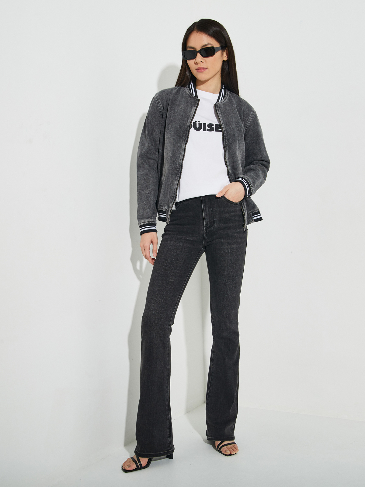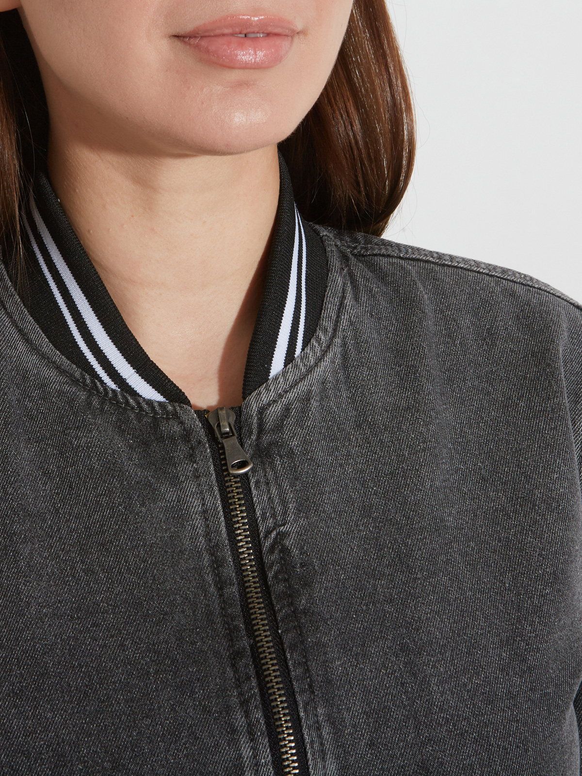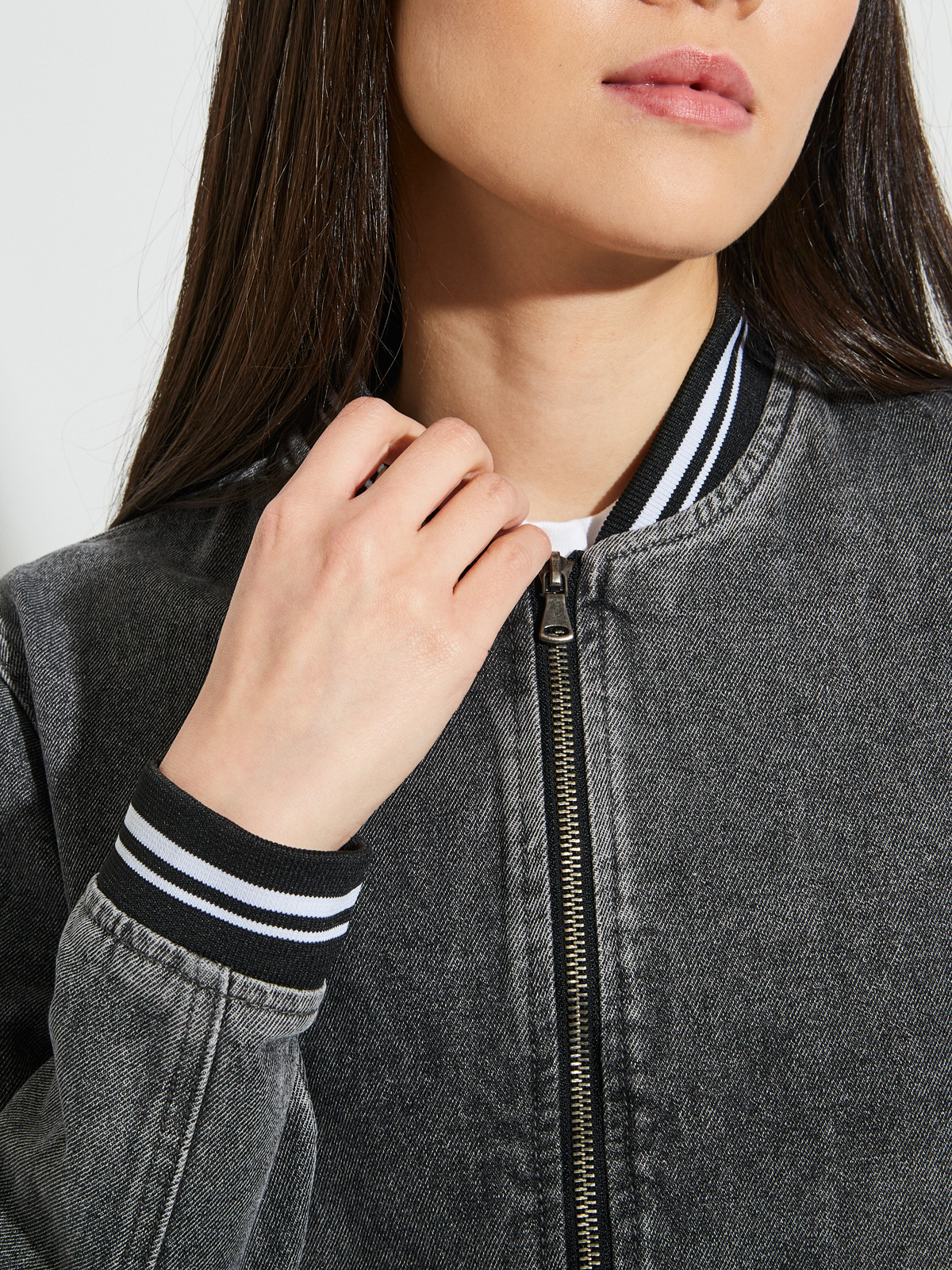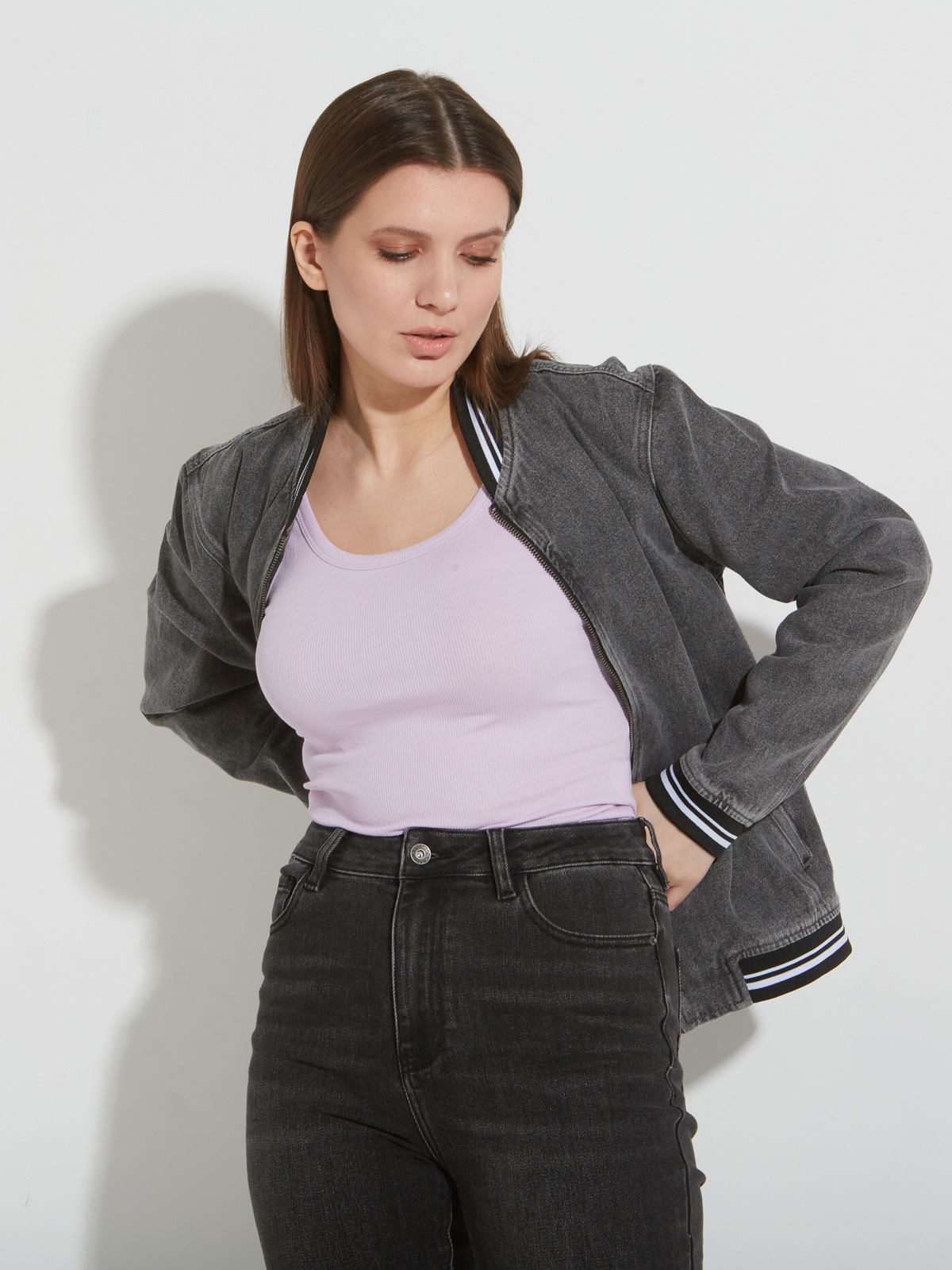 Бомбер женский выполнен из 100 % хлопкового денима с застёжкой на металлическую молнию и боковыми прорезными карманами. Женский бомбер из денима средней плотности с потертостями представляет собой легкую средней длины куртку с эластичной резинкой по нижнему краю и воротнику, а также на плотных манжетах на рукавах. Акцентные трикотажные манжеты в черно-белую полоску, а также пояс и воротник обеспечивают плотное прилегание и защищают от дождя и ветра. Данная модель выполнена из ткани деним в 2-х популярных цветах: синий и серый. Бомбер отлично сочетается с многими моделями джинс из новой коллекции. Женский бомбер имеет широкую размерную сетку, поэтому можно подобрать как на подростка так и бомбер больших размеров для женщин. Размер на модели 44, рост 175 см. Размер модели плюс сайз 46, рост 174 см.