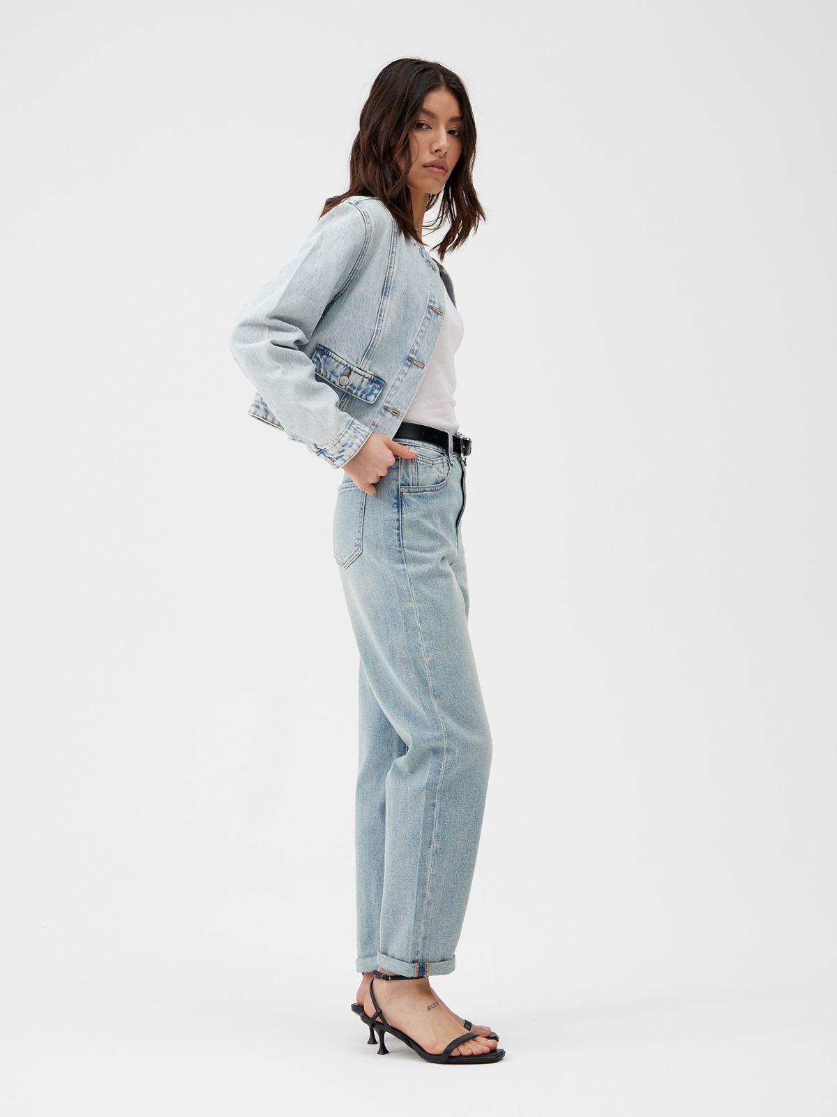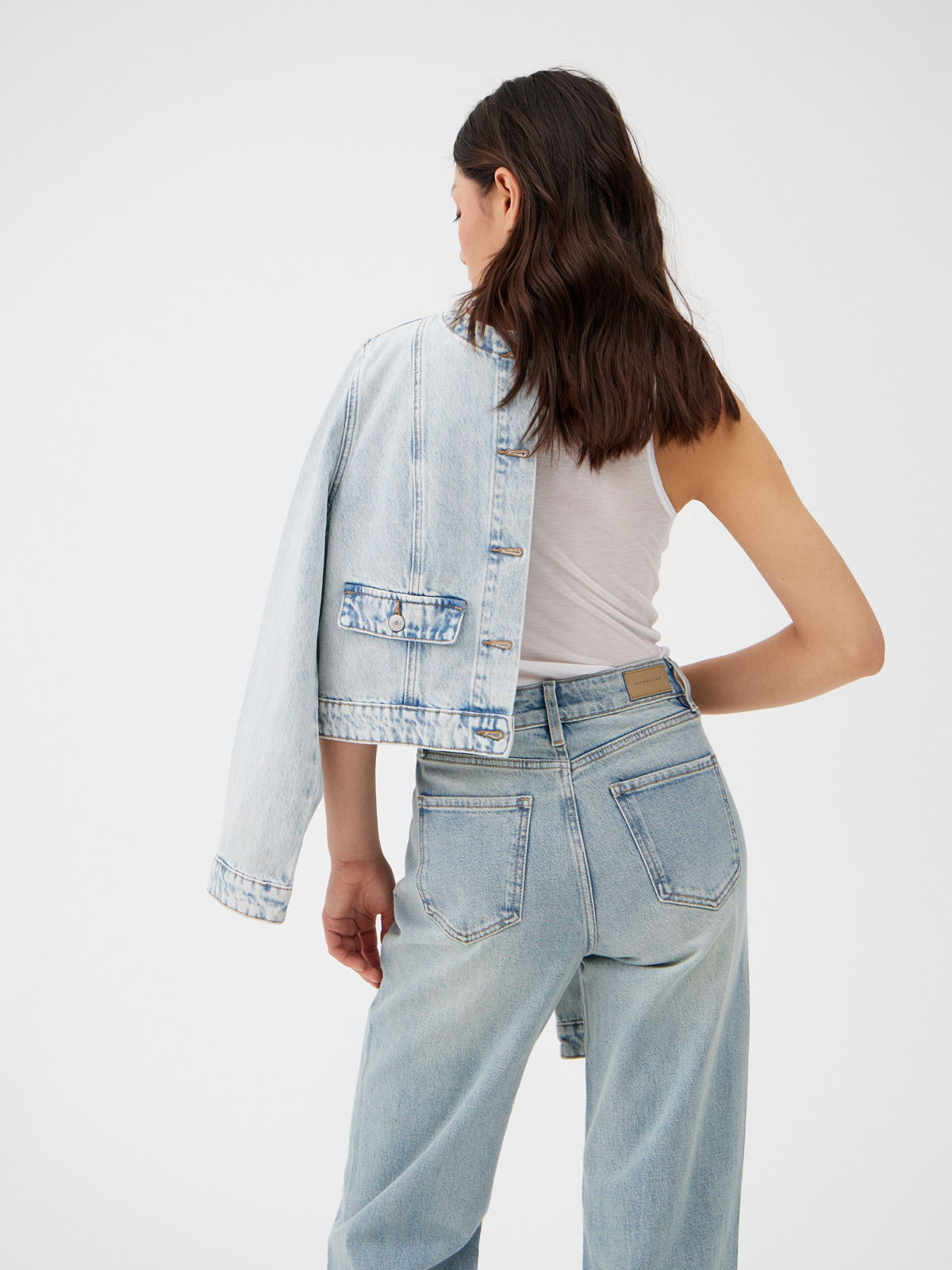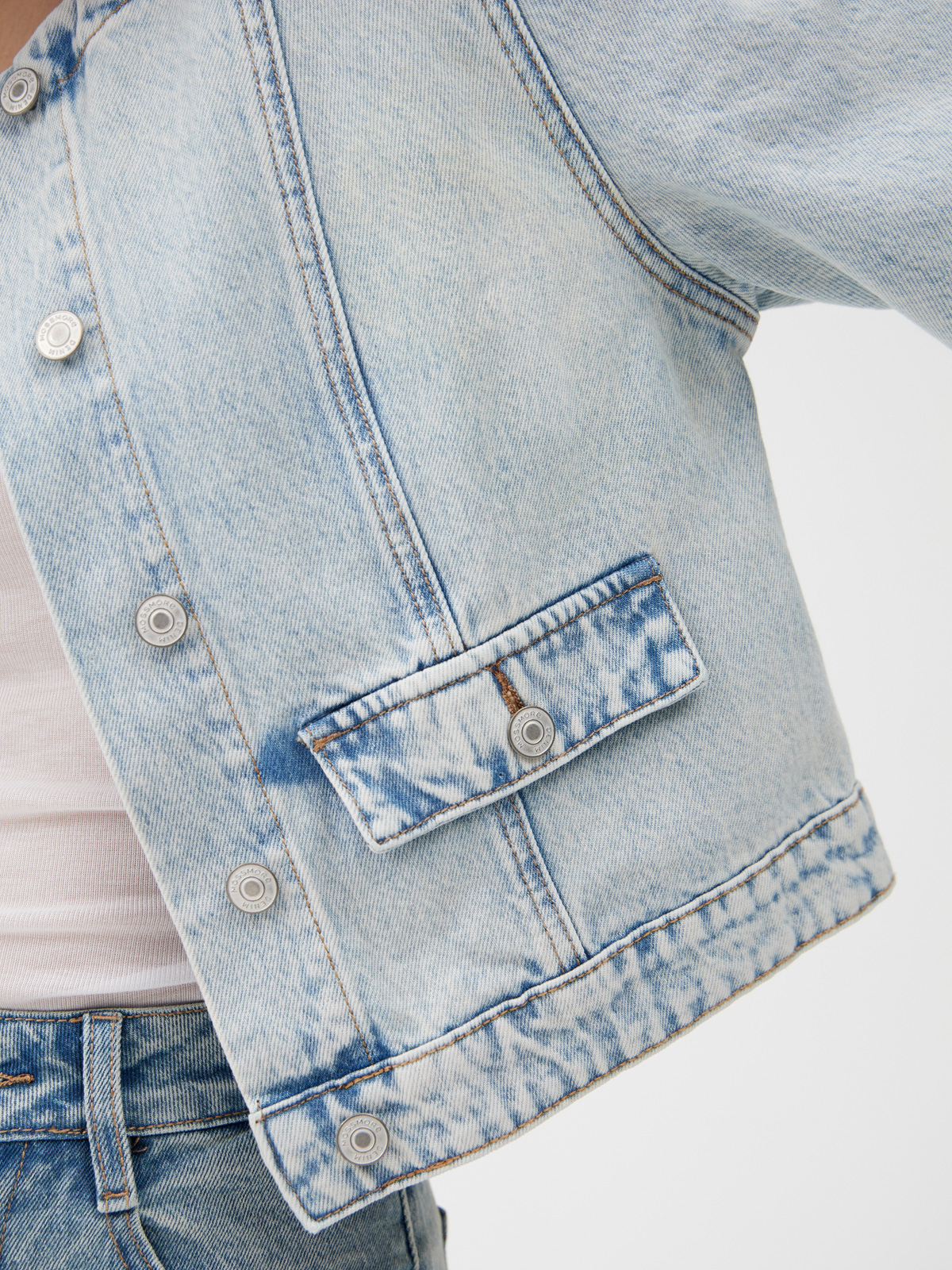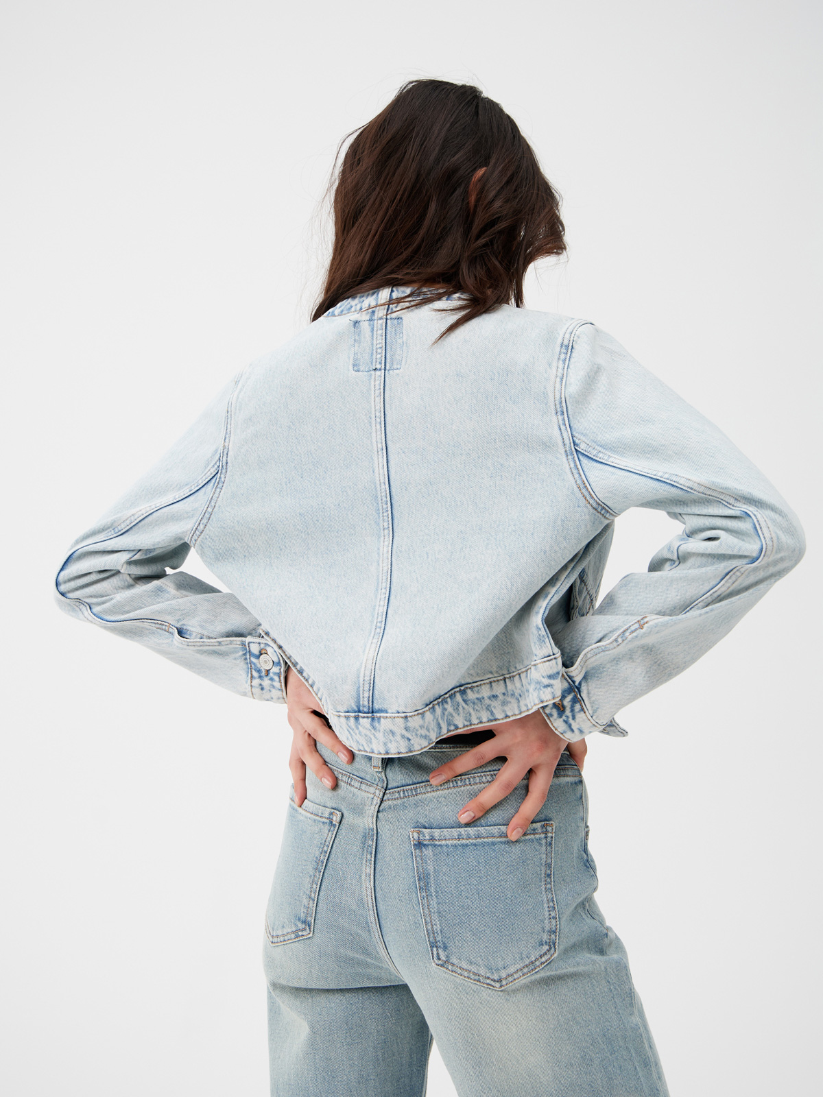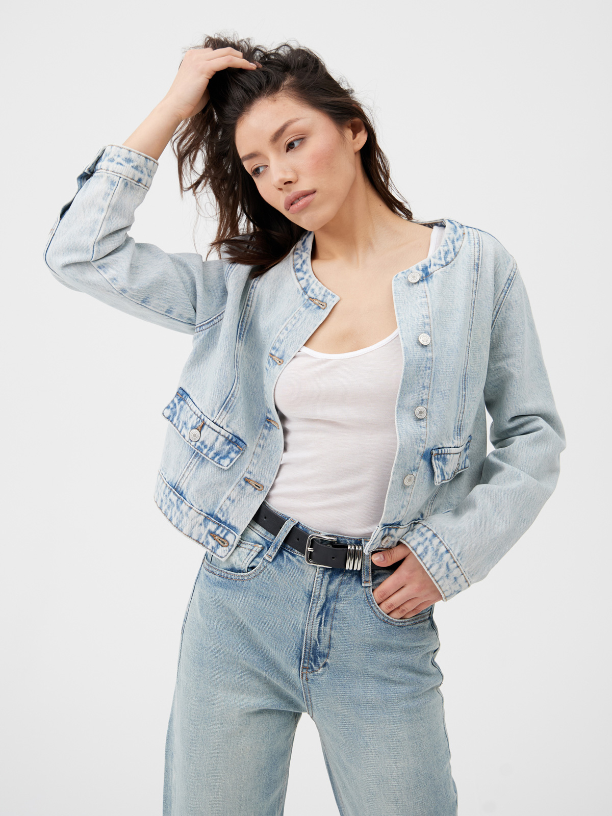 Женская укороченная куртка из хлопкового голубого денима. Укороченный фасон куртки придает образу современности и актуальности. Такая длина подчеркивает талию и создает эффект легкости, прекрасно сочетаясь как с высокими посадками джинс, так и с платьями, создавая сбалансированный и модный образ. Куртка легко стирается и не теряет формы, благодаря качеству материала. Вы сможете наслаждаться ею на протяжении многих сезонов, а также экспериментировать с образами. Круглый вырез горловины придает куртке элегантности и аккуратности, легко подчеркивая линию шеи. Металлические пуговицы не только добавляют стильный акцент, но и обеспечивают надежность и долговечность изделий, что важно для активного образа жизни. Эта универсальная модель станет идеальным дополнением к вашему гардеробу, подчеркивая вашу индивидуальность и чувство стиля. Детали: укороченный крой, круглый вырез горловины, застёжка на металлические пуговицы.