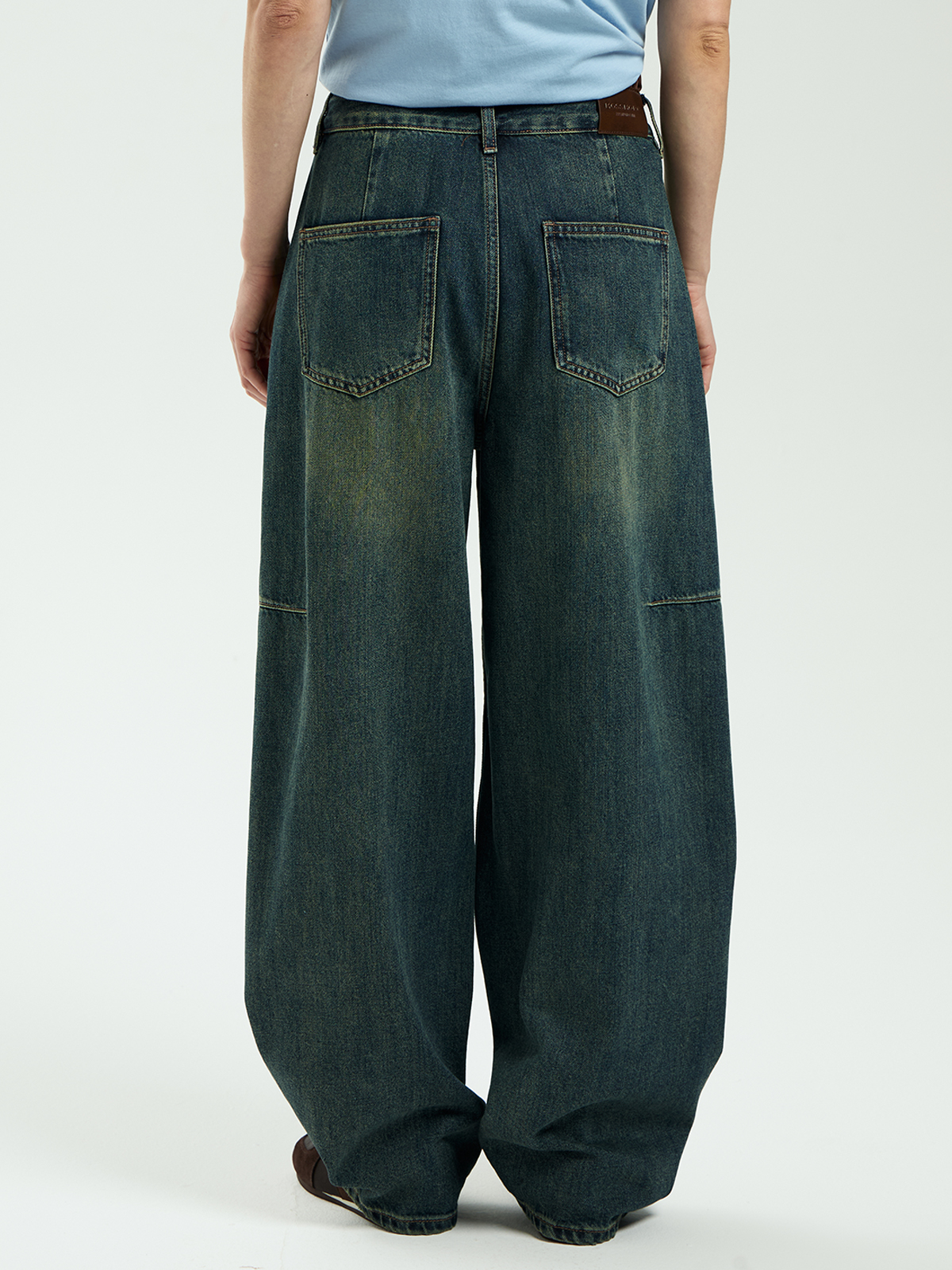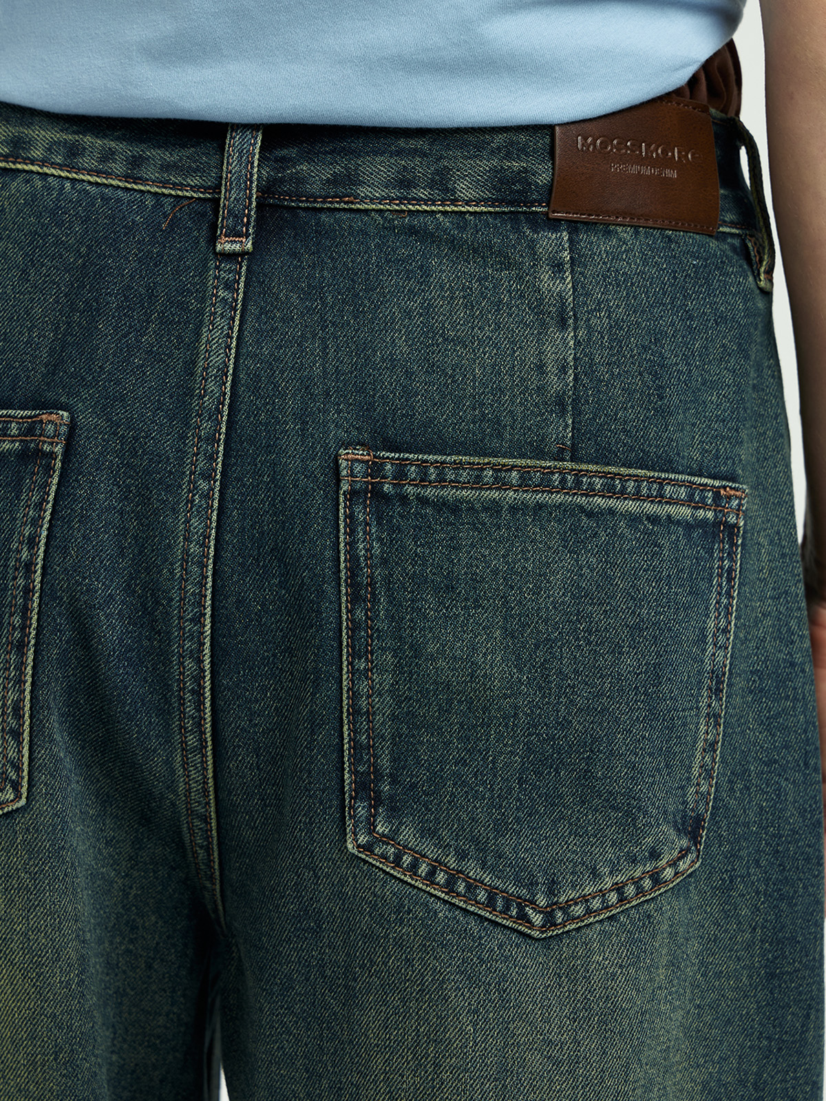 Особенность: 100% хлопок, средняя плотность, винтажный оттенок, два варианта посадки (высокая и на бёдрах), скошенный шов по всей длине, горизонтальный декоративный элемент выше колена