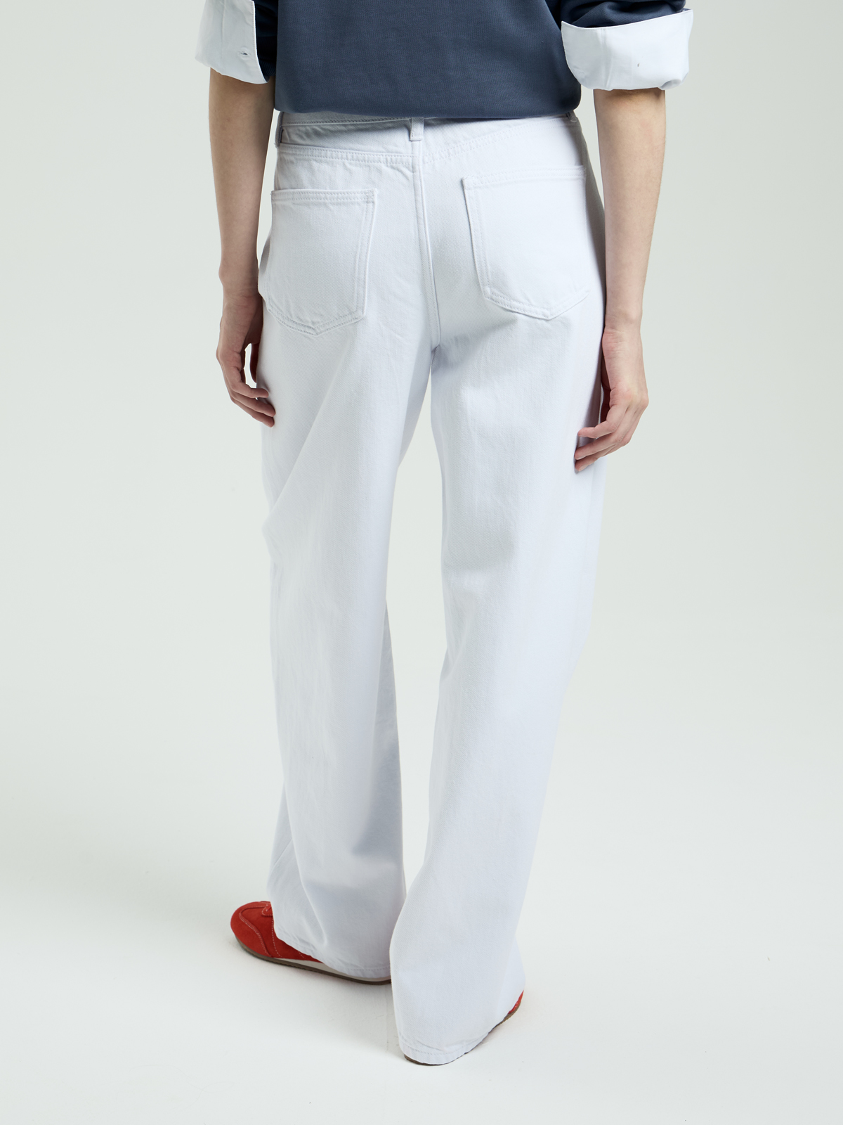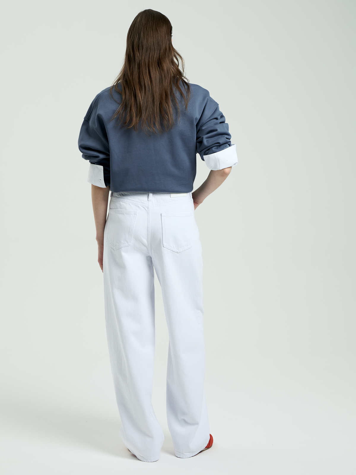 Модель выполнена из 100% хлопка средней плотности — натуральная ткань хорошо дышит и дарит комфорт в течение всего дня. Универсальность модели — в двух вариантах посадки: джинсы можно носить как на высокой посадке, так и на бёдрах, меняя силуэт в зависимости от настроения. Свободный крой бэгги создаёт расслабленный современный образ, который остаётся в тренде. Модель дополнена пятью классическими карманами.