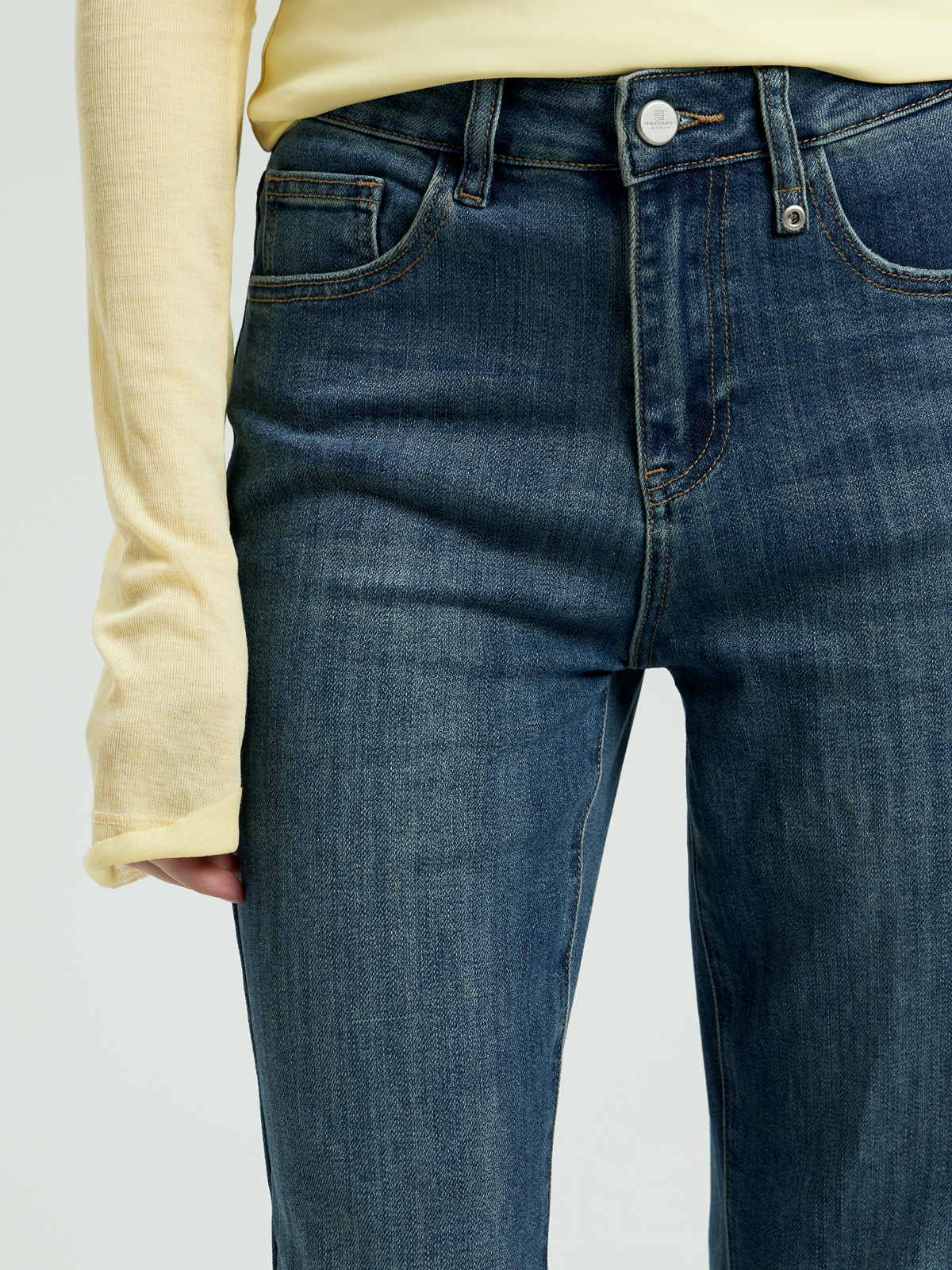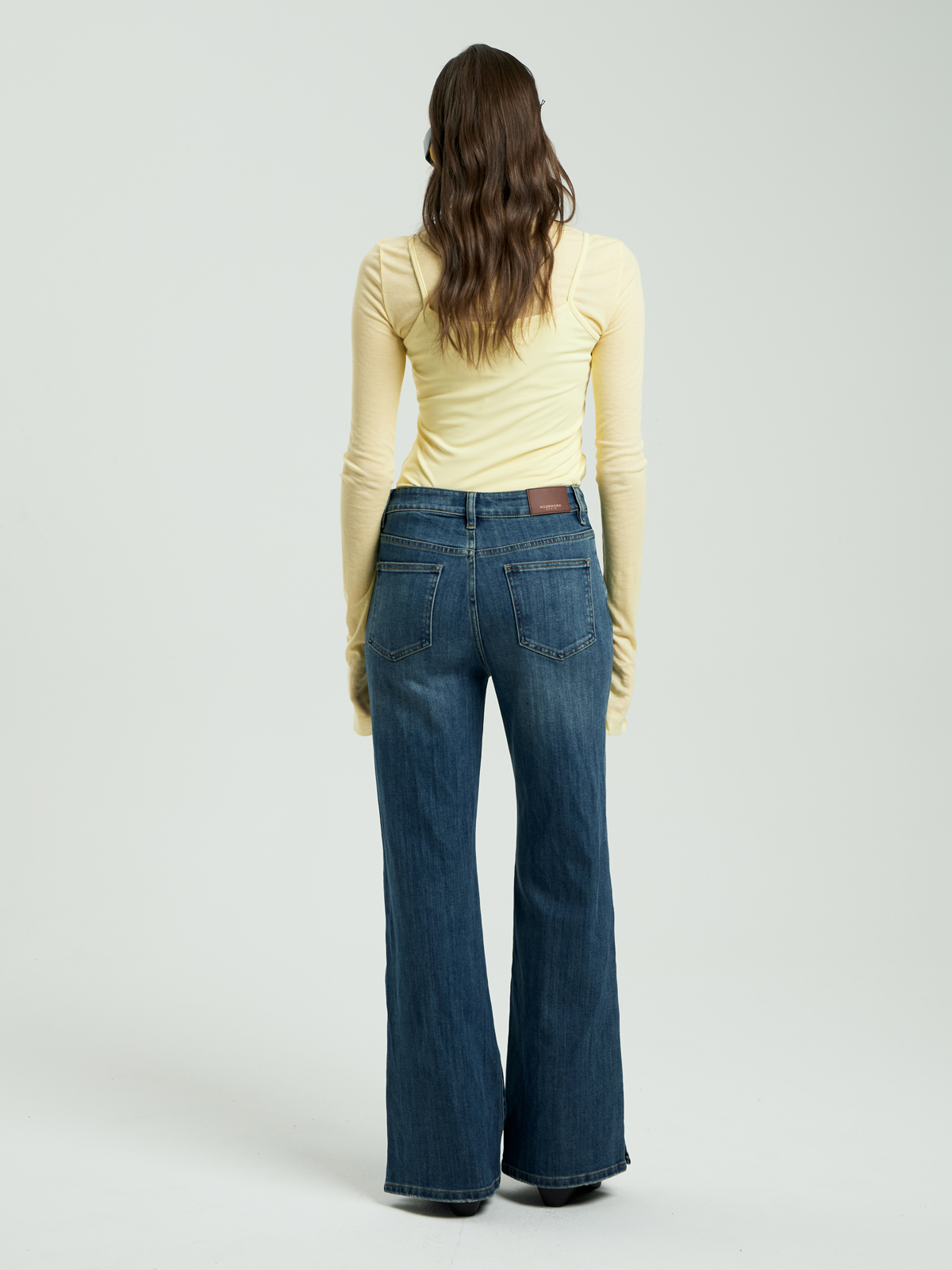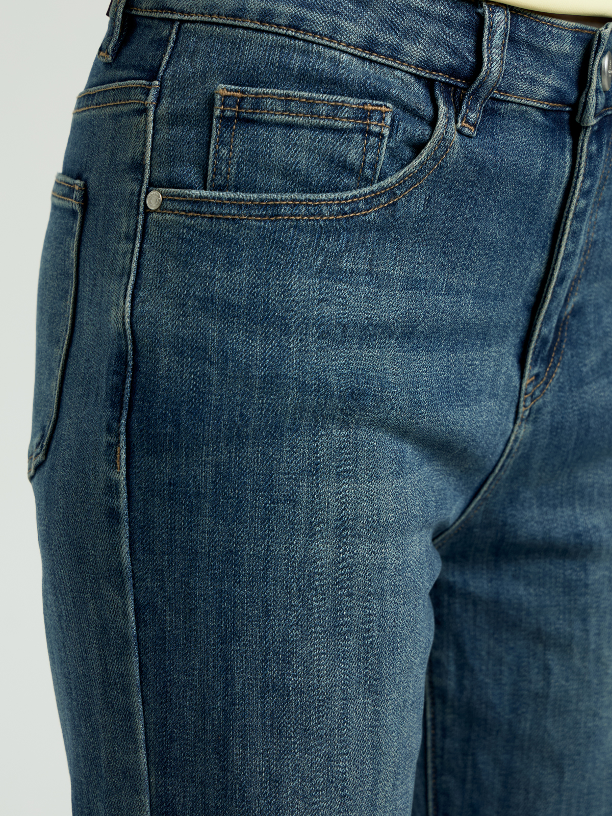 Модель выполнена из денима средней плотности с добавлением эластичной нити — ткань мягкая, хорошо тянется. Средняя посадка обеспечивает универсальность. Лёгкий винтажный эффект придаёт благородный вид. Клёш от колена создаёт женственный силуэт. Особенность — небольшие разрезы с внешней стороны по низу штанин, добавляющие динамики. Пять классических карманов завершают образ.