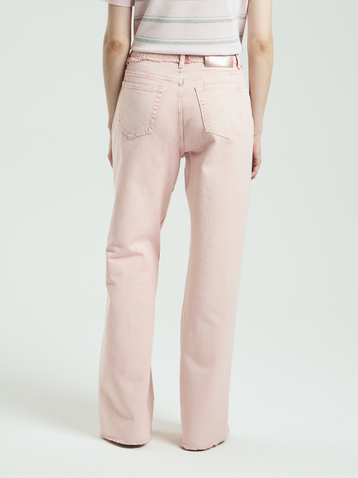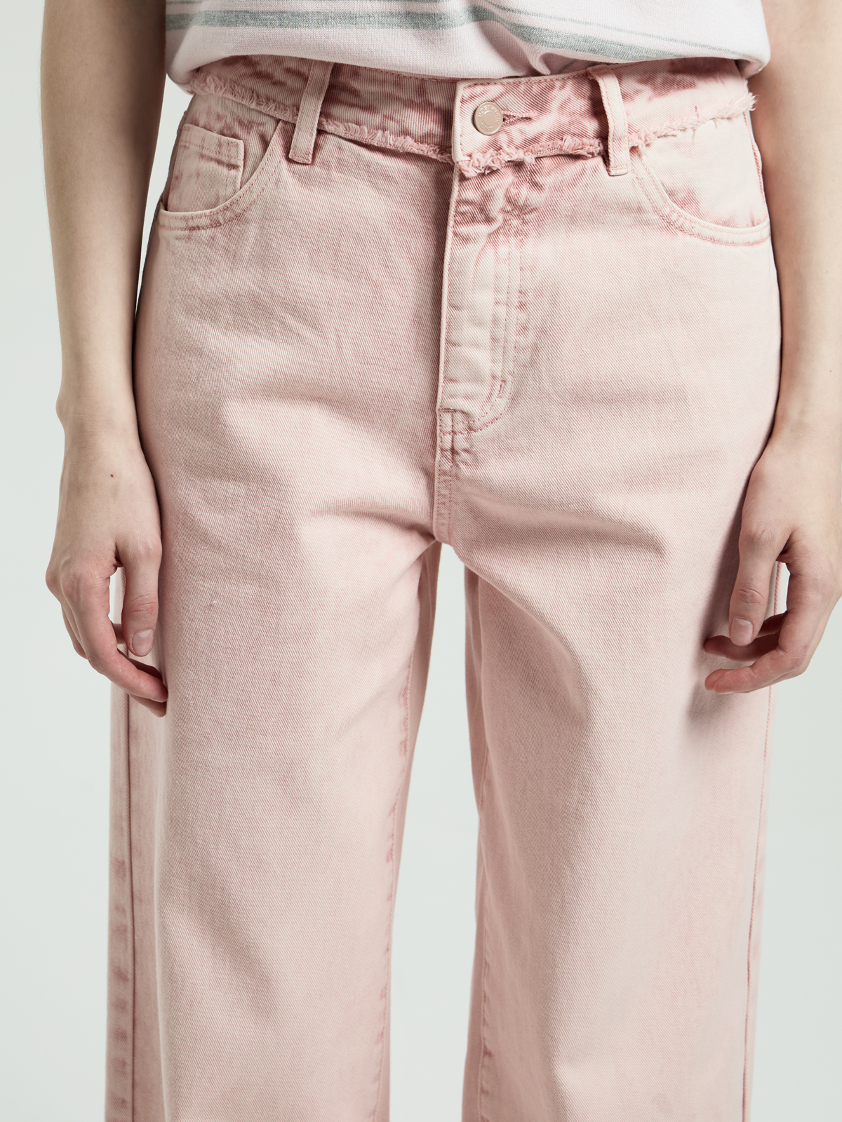 Модель выполнена из 100% хлопка средней плотности — ткань мягкая и приятная на ощупь. Завышенная посадка подчёркивает талию. Свободный широкий крой создаёт расслабленный силуэт. Нижний край пояса и низ штанин выполнены с необработанным краем и декоративной бахромой. Легкая потертость придаёт естественный винтажный вид. Модель представлена в двух оттенках: нежном пудровом и универсальном светло-бежевом. Пять классических карманов завершают образ.