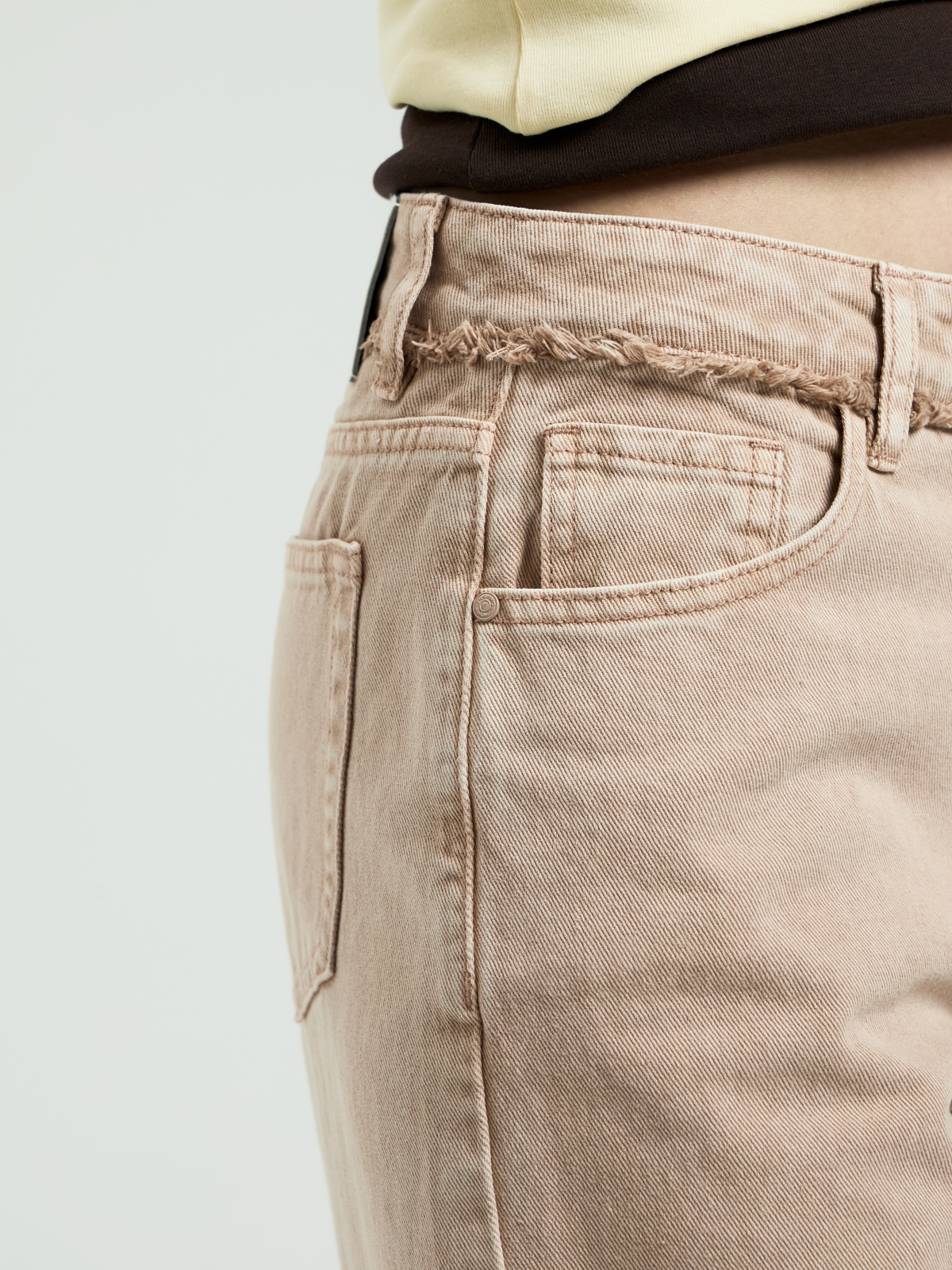 Особенность: 100% хлопок, средняя плотность, мягкая ткань, завышенная посадка, бахрома на поясе и по низу, легкая потертость, два цвета (пудровый, светло-бежевый)
