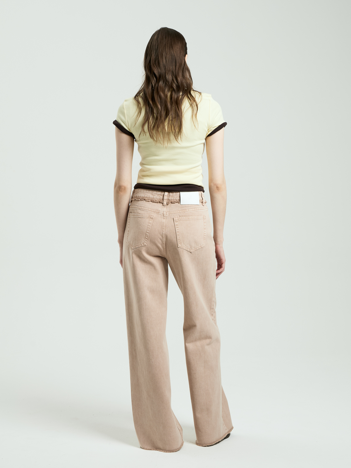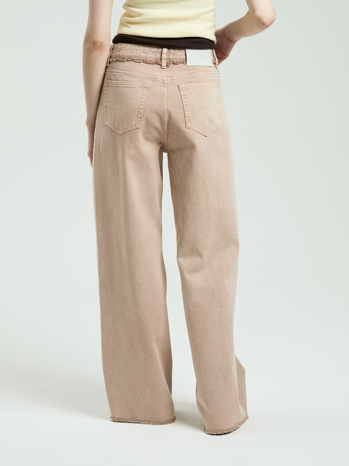 Модель выполнена из 100% хлопка средней плотности — ткань мягкая и приятная на ощупь. Завышенная посадка подчёркивает талию. Свободный широкий крой создаёт расслабленный силуэт. Нижний край пояса и низ штанин выполнены с необработанным краем и декоративной бахромой. Легкая потертость придаёт естественный винтажный вид. Модель представлена в двух оттенках: нежном пудровом и универсальном светло-бежевом. Пять классических карманов завершают образ.