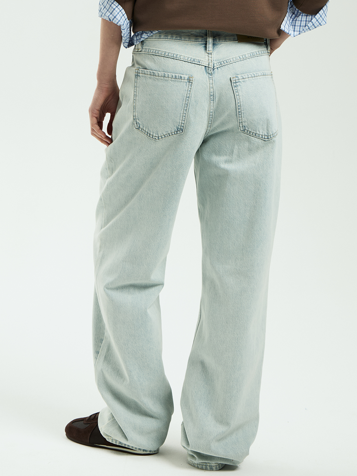 Особенность: 100% хлопок, средняя плотность, высокая посадка, лёгкий винтажный цвет, контрастная шлёвка на поясе