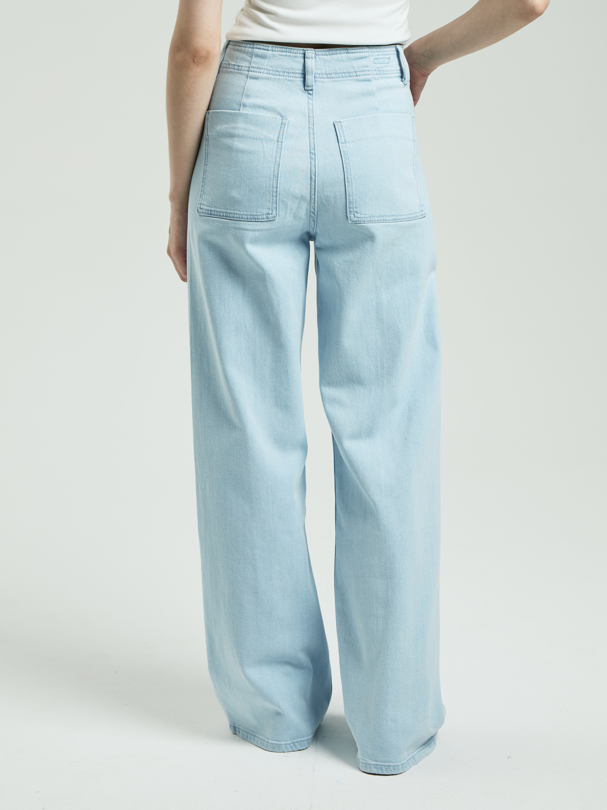 Модель выполнена из качественного денима с добавлением эластичной нити — ткань хорошо тянется и дарит комфорт. Завышенная посадка подчёркивает талию. Свободный широкий крой создаёт расслабленный силуэт. Особенность — акцентные швы-стрелки спереди по всей длине штанин. Они добавляют строгости и визуально вытягивают ноги. Сзади предусмотрены два классических кармана.