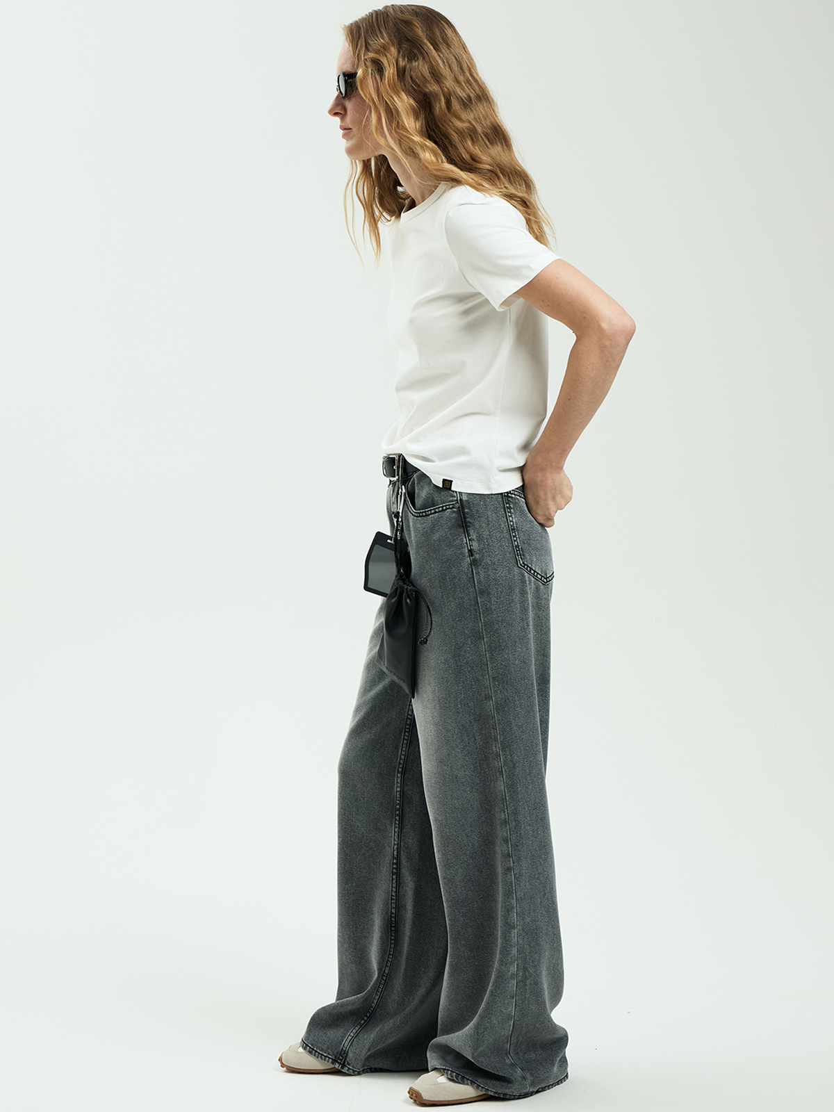 Модель из облегчённой мягкой ткани: тенсел 60%, полиэстер 26%, вискоза 14% — состав обеспечивает лёгкость и воздухопроницаемость. Свободный крой ШИРОКИЕ создаёт расслабленный силуэт. По спинке пояса — резинка для комфортной посадки. Лёгкая потертость придаёт естественный вид. Пять карманов.